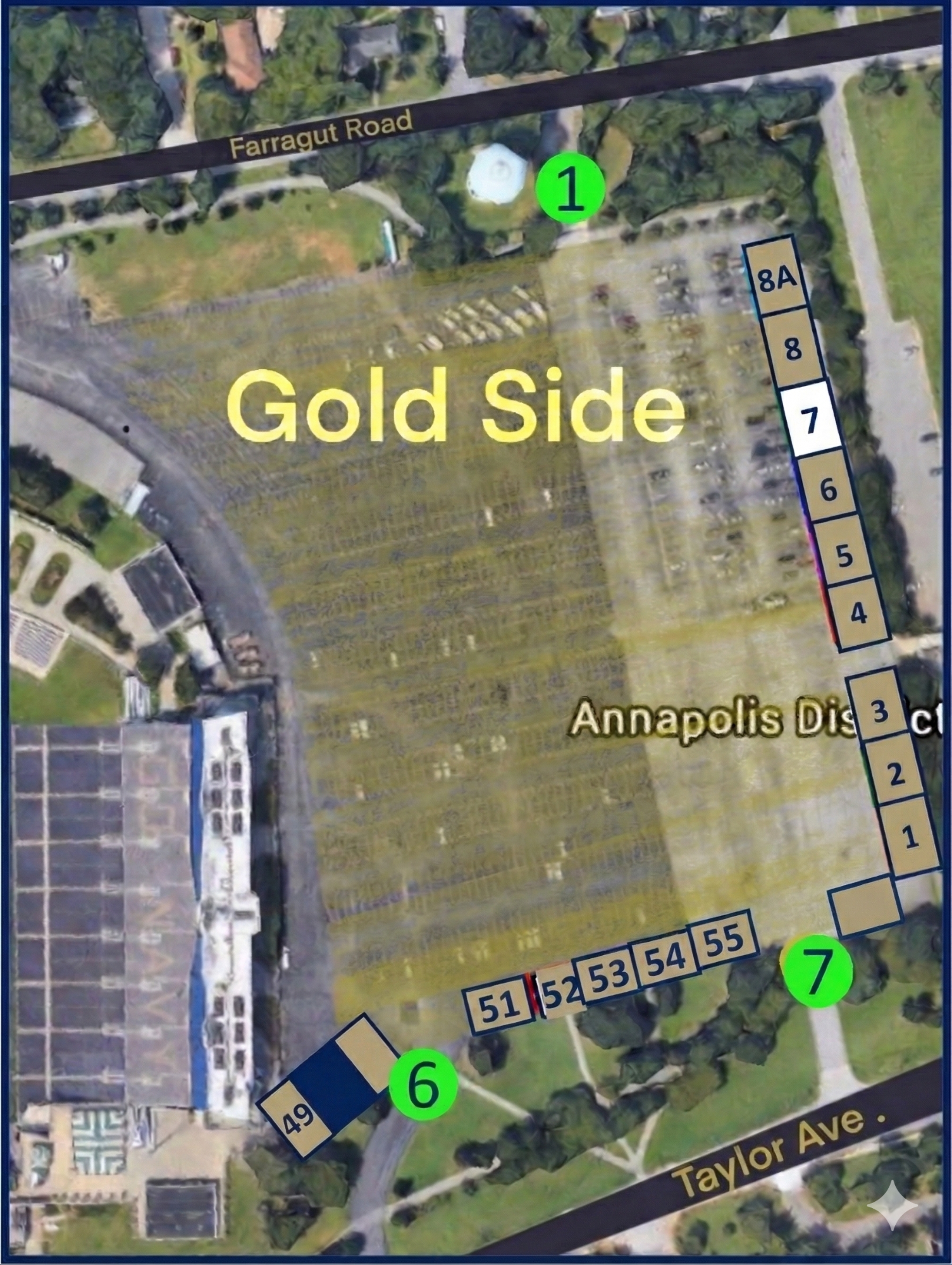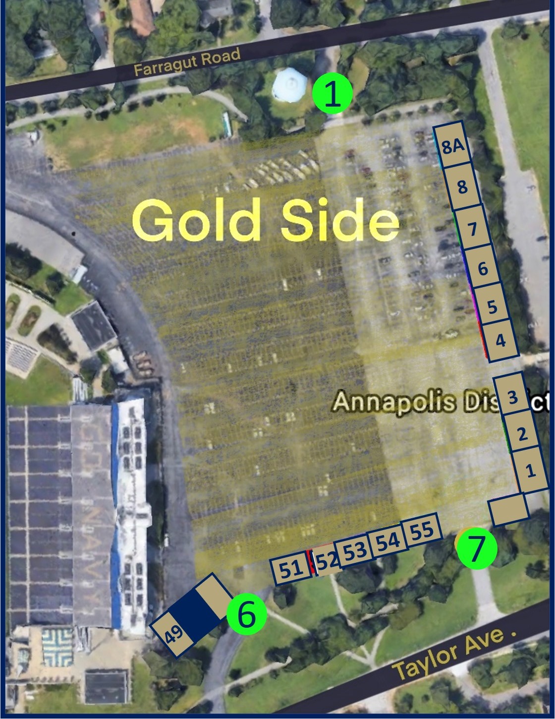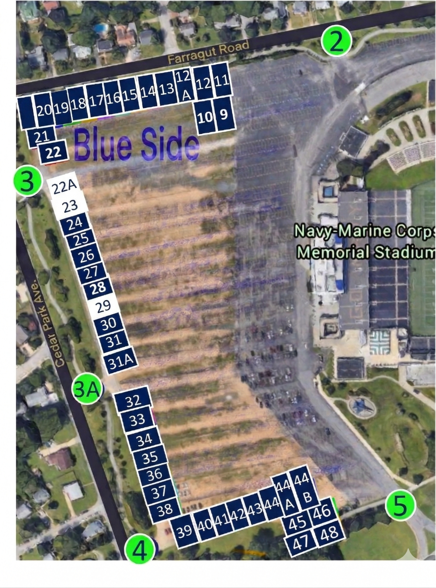 Roughly 70 spots are held for perimeter tailgaters which includes groups such as: USNA graduate classes, midshipmen and civilian groups. Each group enrolled in the program pays a nominal fee prior to the start of the season. The typical spot is roughly 30'x 45' which can accommodate at least a 20'x 20' tent.